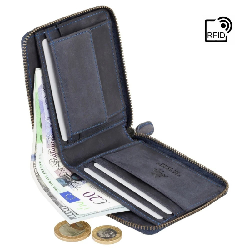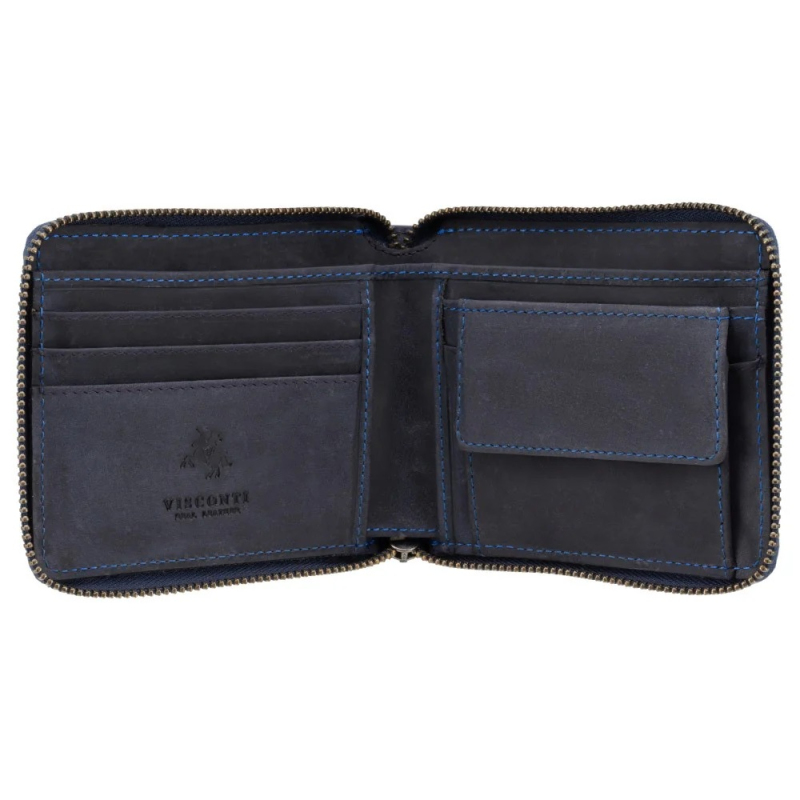 Značková pánská kožená peněženka se zipem se vyznačuje na omak příjemnou prémiovou přírodní kůží, kvalitním ručním prošitím a vkusnou podšívkou Visconti.